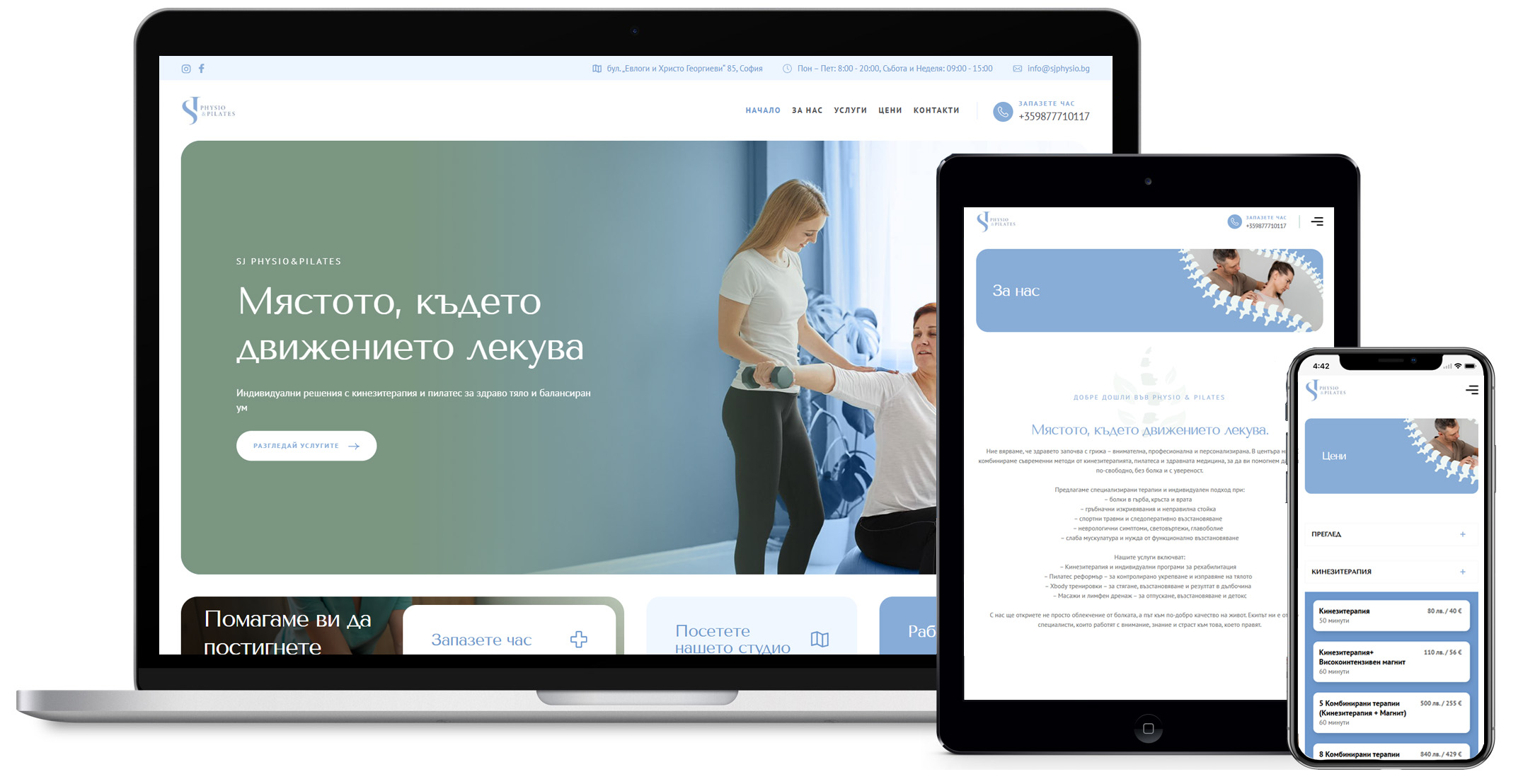 Разработихме изчистен и професионален WordPress сайт за SJ Physio – студио за кинезитерапия и пилатес. Сайтът представя услугите на студиото по достъпен и модерен начин, подчертава екипа и подхода, включва функционалности като форма за записване на час и мобилна оптимизация. Визуалната рамка е подбрана да отразява атмосферата на спокойствие и възстановяване, като навигацията е интуитивна и потребителски ориентирана.