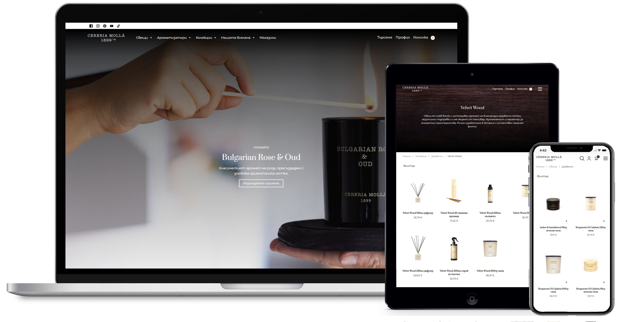Разработихме модерен и стилово изчистен WordPress сайт за Cereria Molla – бранд, фокусиран върху висококачествени ароматни продукти за дома. Проектът включваше изграждане на цялостна структура, визуална концепция и продуктови секции, които подчертават премиум характера на марката. Дизайнът комбинира елегантна типография, ненатрапчиви цветове и плавна навигация